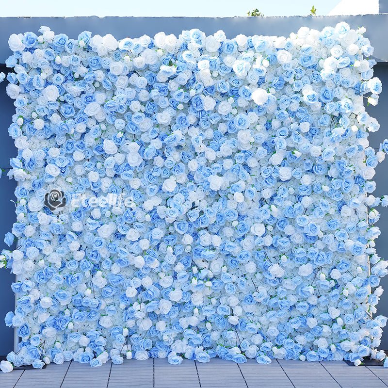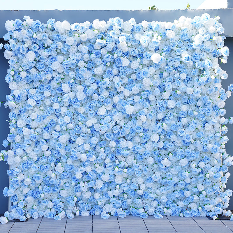 Angela Flower Blue White Rose Rolling Up 5D Cloth Flower Wall Outdoor Wedding Backdrop Decor Fabric Curtain Flower Wall Arrangement A7839