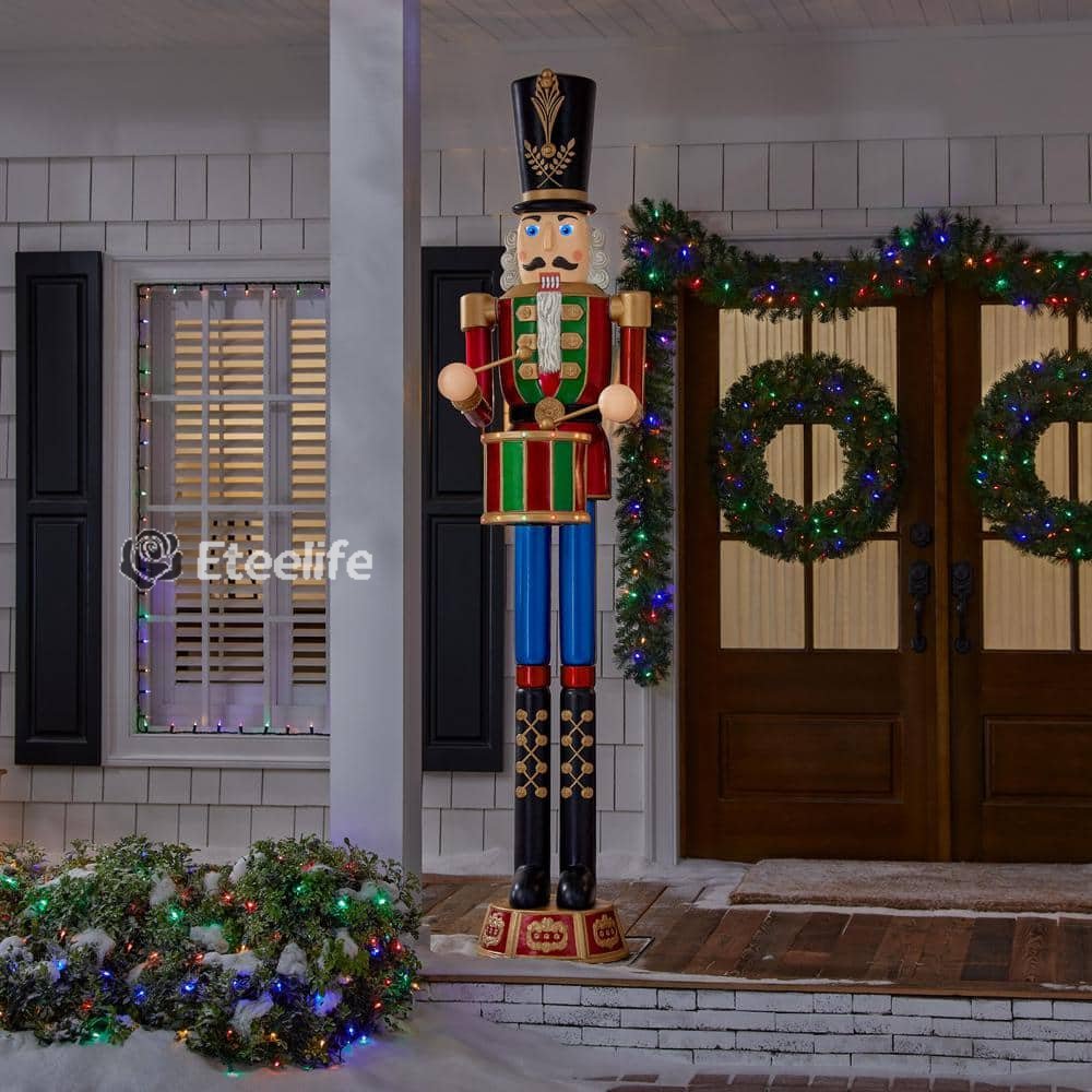 Decorate your lawn or front porch for a festive look with this 8-foot animated nutcracker yard sculpture. Illuminated with red LEDs, the digital eyes move and blink to deliver an eye-catching impression throughout the holidays, while the background music spreads seasonal cheer. A metal frame allows safe setup, and the integrated settings let you easily adjust the volume. Featuring a multicolored design, this nutcracker blends in with your decorative scheme, while the polystyrene material withstands wear and tear. This animated nutcracker yard sculpture collapses after your celebration for simplified storage.