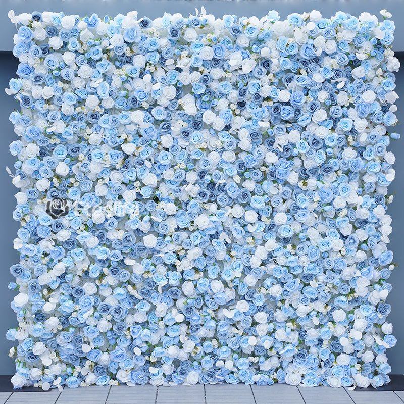 Angela Flower 5D Blue White Rose Rolling Up Cloth Curtain Flower Wall Wedding Backdrop Decor Fabric Milan Turf Plants Wall Party Prop A7849