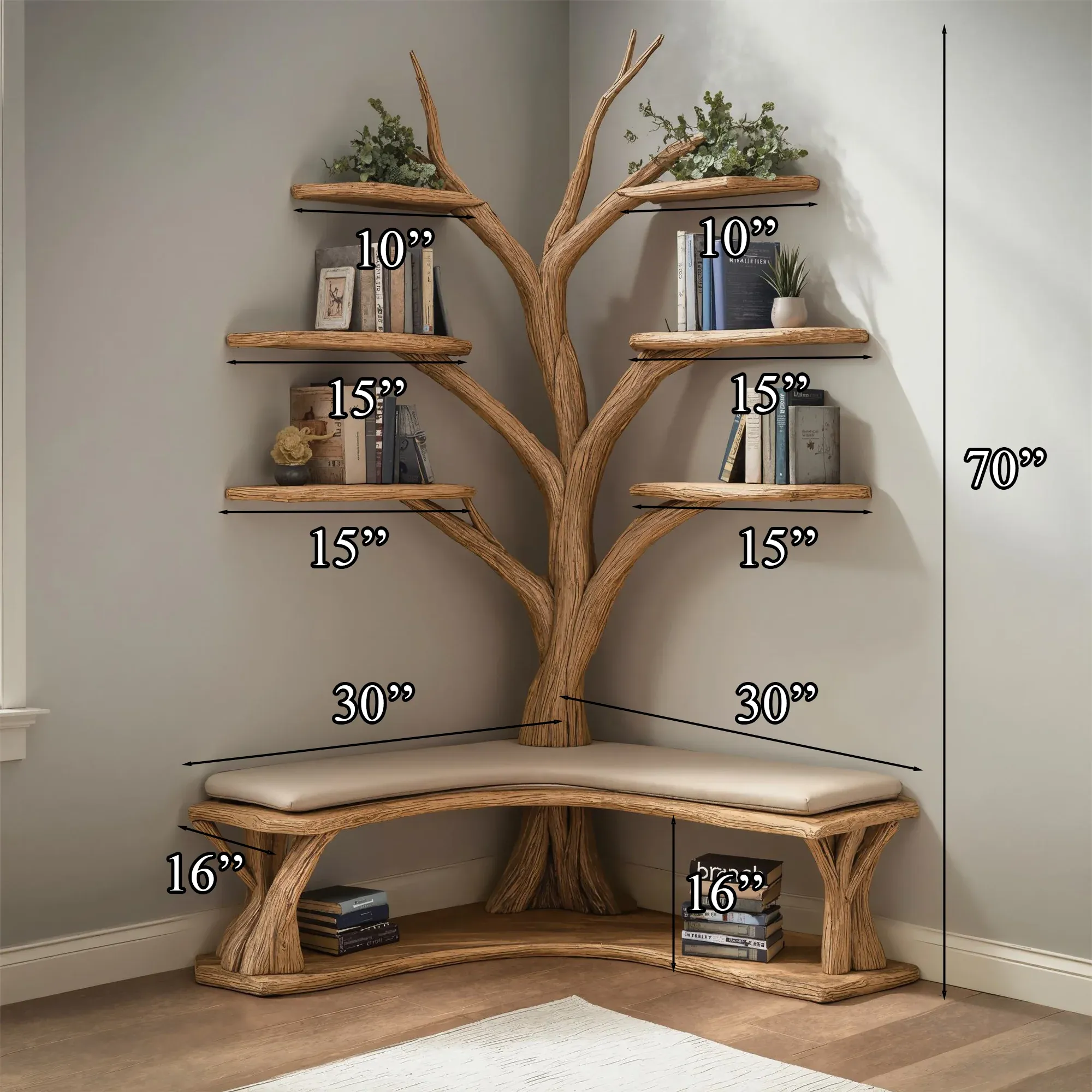 The Tree Branch Bookshelf with L-Shaped Bench offers a stylish, functional solution for book storage and seating, adding nature-inspired charm to any space.