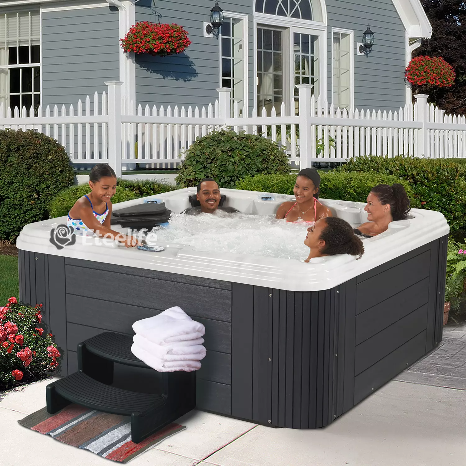 Enjoy the soothing hot water as you are surrounded by bubble jets, with 5 of your closest friends. It has an easy-to-use control panel that activates the 170 high-powered bubble jets that surround the interior of the spa, giving you a beautiful and relaxing massage.