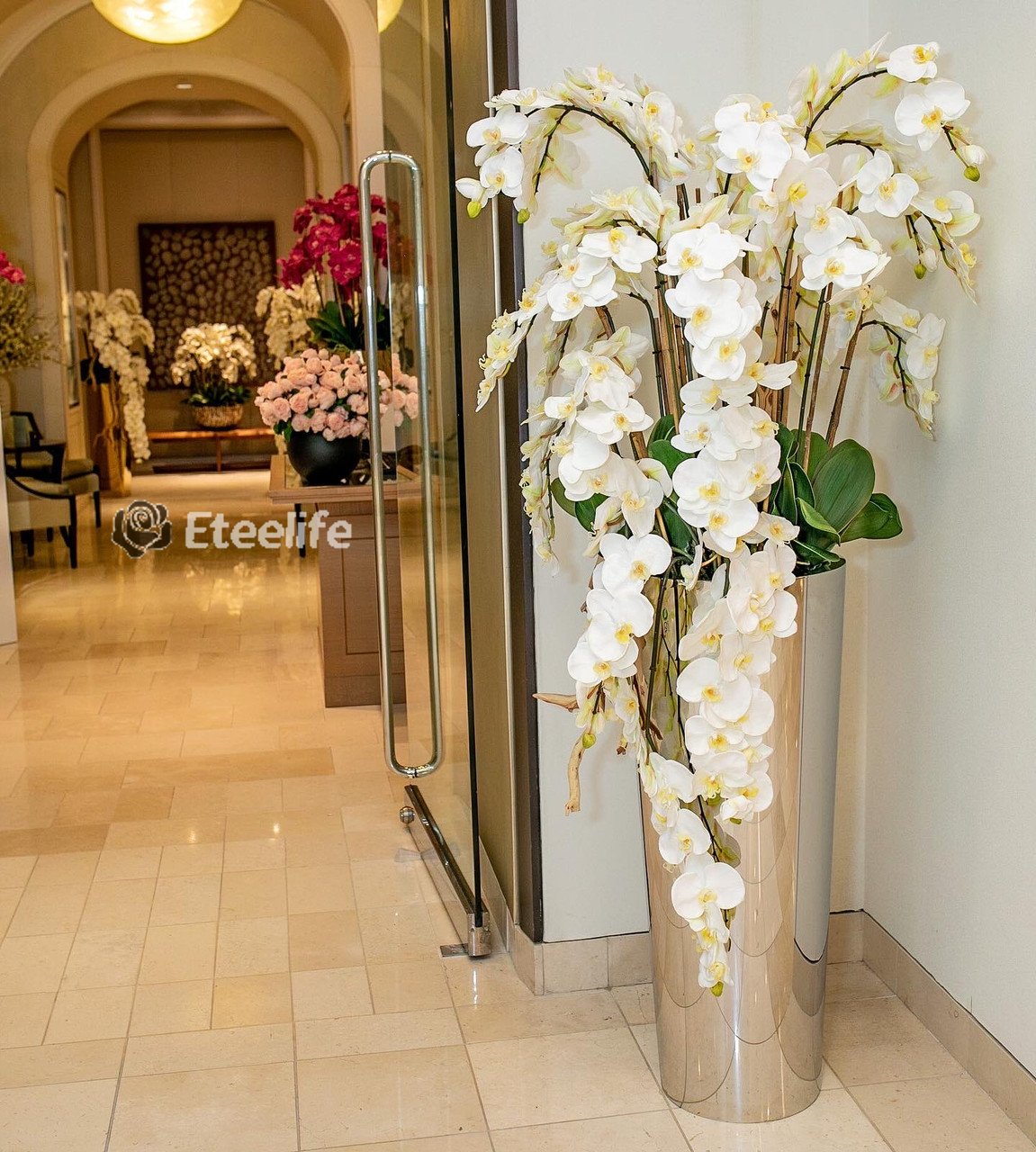 The ultimate luxury statement, this design features a high gloss stainless steel tapered cone planter in stainless steel paired with beautiful cascading white phalaenopsis orchids. Each piece is carefully crafted and polished to achieve a luxurious mirror finish. No need to water these beauties! Durable, they will last you years, and will remain beautiful year round! Designed with the upmost attention to detail and manufactured from top quality material, this piece is both luxurious and realistic.