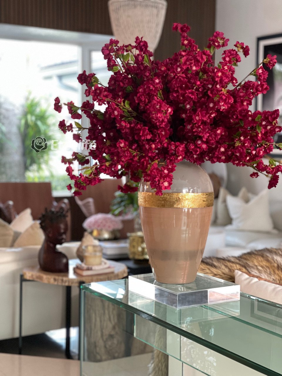 This bouquet of elegant burgundy cherry a adds a fresh and stylish touch to any room. The branches are presented in a our goddess glass vase, anchored in illusion water and are the perfect decorative accent for a large coffee table or dining room console.