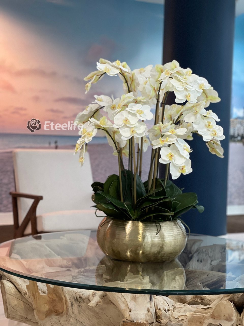 Graceful and exotic, the white orchid has symbolized integrity, nobility, and luxury for centuries. Our enduring, delicate white phalaenopsis arrangement captures the artistry and spirit of natural orchids. It’s prized for its profusion of perfect blooms. Vertical bamboo stakes, broad green leaves, and a genuine moss base add to the realism of this arrangement. Set in our metal bowie bowl, a rounded silhouette and textured pattern finish, that is cast from aluminum, then polished and electro-plated for a gold finish, it makes an elegant tabletop accent. Display a pair for extra-lush sophistication.