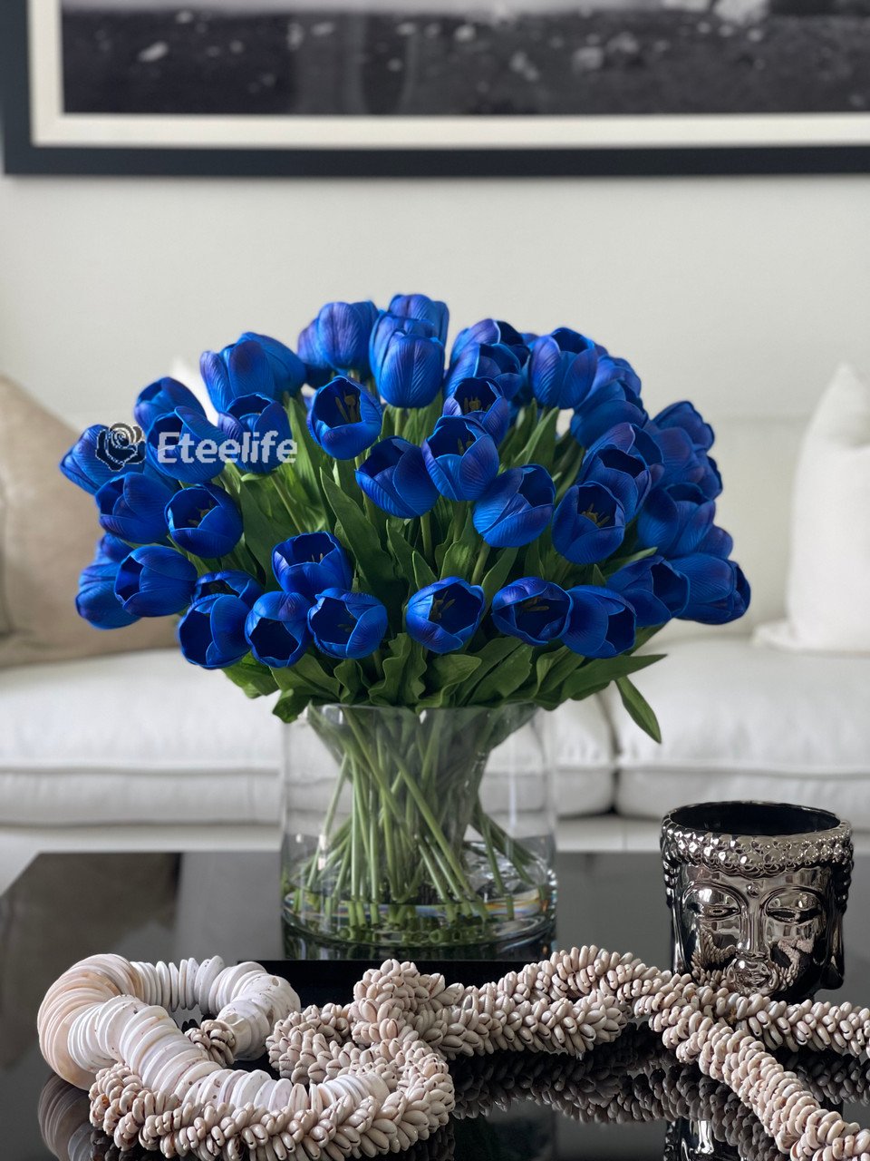 This arrangement features a bountiful bunch of blue tulips is simply breathtaking. Handcrafted and uncommonly lifelike, these blooms mixed with shapely leaves look as though they were just picked from a spring garden. This crisp and clean arrangement is set in a glass cylinder with acrylic “water,” adding to its realistic charm.