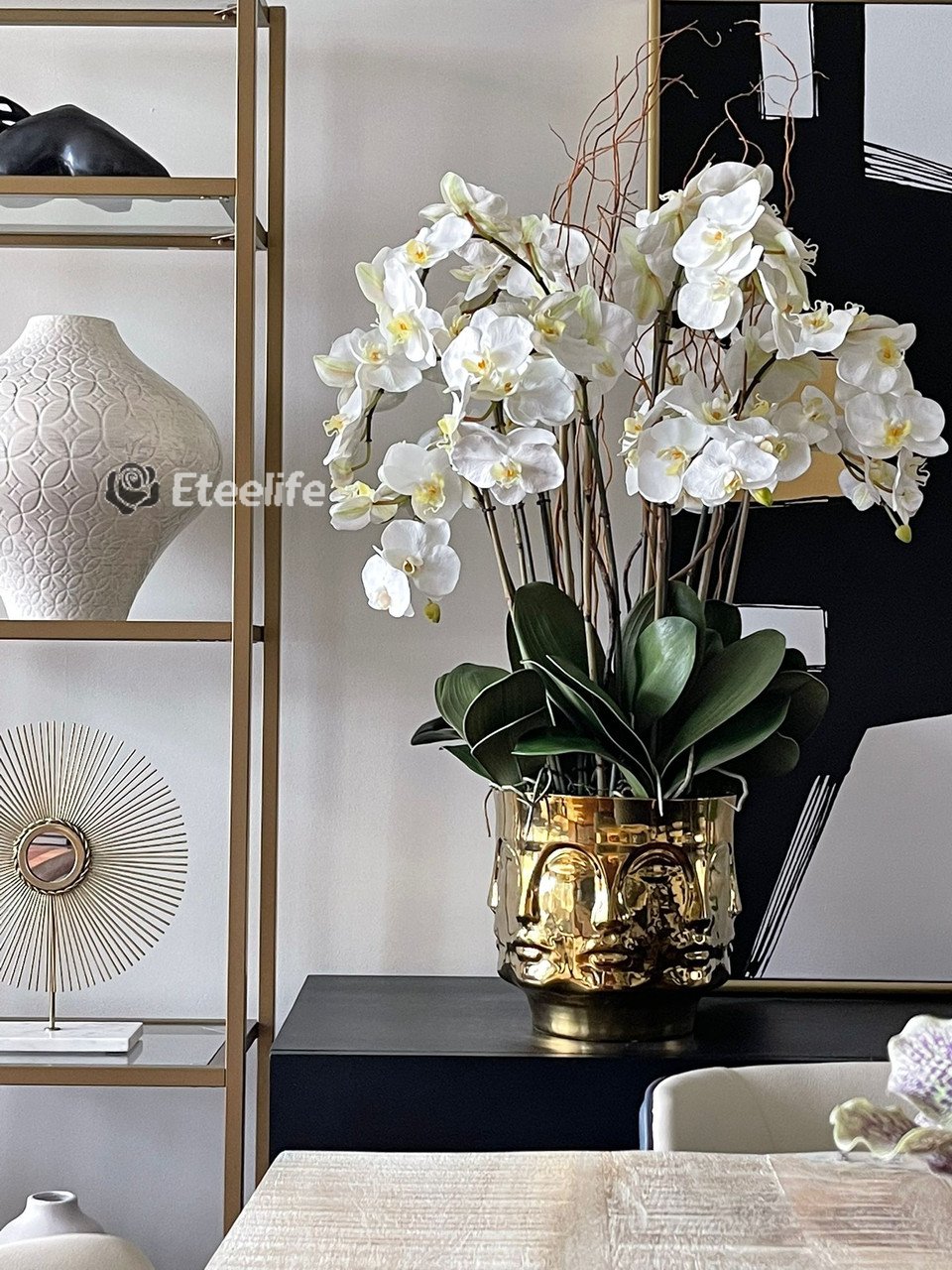 Our Polished Gold Visage Vase with Phalaenopsis Orchids is beautifully crafted. It’s a 360 degrees show stopper guaranteed to be a conversation piece. An ultimate luxury statement to any coffee table, console, vanity, or kitchen counter.