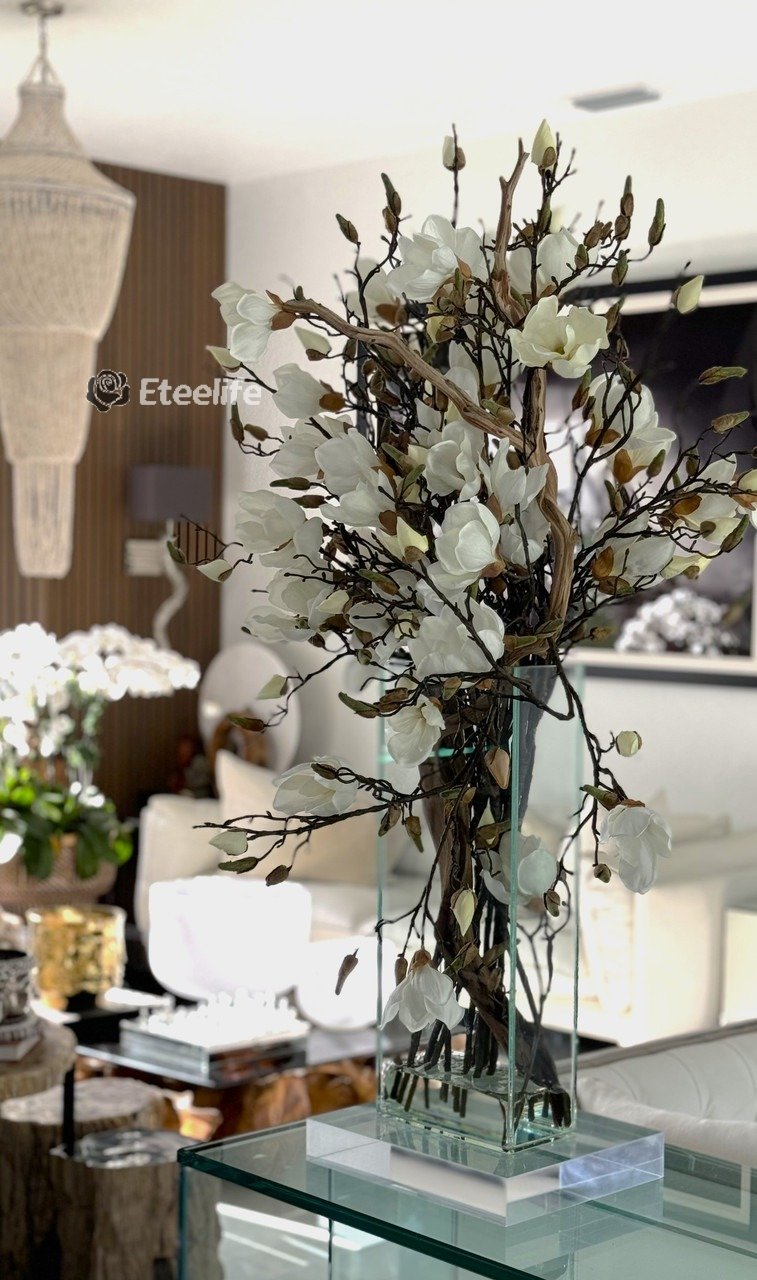 20″ tall Casa Moderna glass planter with multiple stems of white magnolia blossoms, foliage and sand blasted grape wood anchored in our illusion water. Enjoy beautiful, lifelike magnolia tree branches that won’t fade after spring awakens. Displayed here in a stylish clear glass planter, magnolia flowers are cheerful and elegant in any season. Each hand-placed blossom and leaf is crafted with vivid color and exceptional detail, a tribute to Mother Nature’s artistry. Showcase this lovely faux tree on your dining table or living room tabletop.