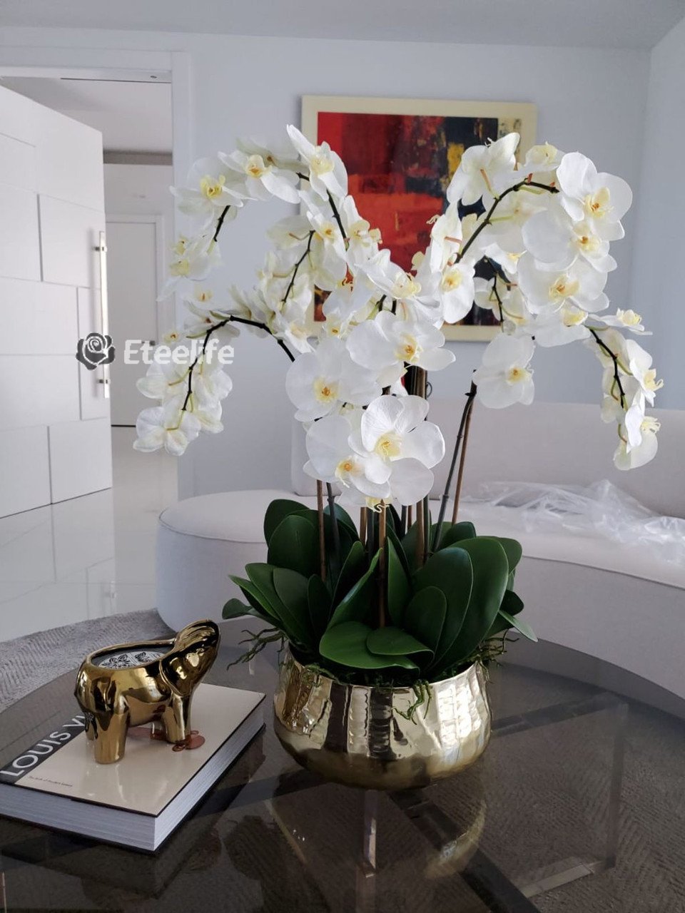 Graceful and exotic, the white orchid has symbolized integrity, nobility, and luxury for centuries. Our enduring, snow white phalaenopsis arrangement captures the artistry and spirit of natural orchids. It’s prized for its profusion of perfect blooms. Vertical bamboo stakes, broad green leaves, and a genuine moss base add to the realism of this arrangement. Often called the “moth orchid,” the phalaenopsis is a favorite among our designers for its dense leaves, elegantly arching sprays and lovely white blooms. Our remarkably lifelike arrangement is staked into a moss-covered base in an elegant gold planter for a timeless, authentic look that will endure for years to come. This arrangement is just the right size and is versatile enough to use as a coffee table centerpiece, a dining room or console table. It has a luscious tropical feel that will add vibrancy and elegance to any room.