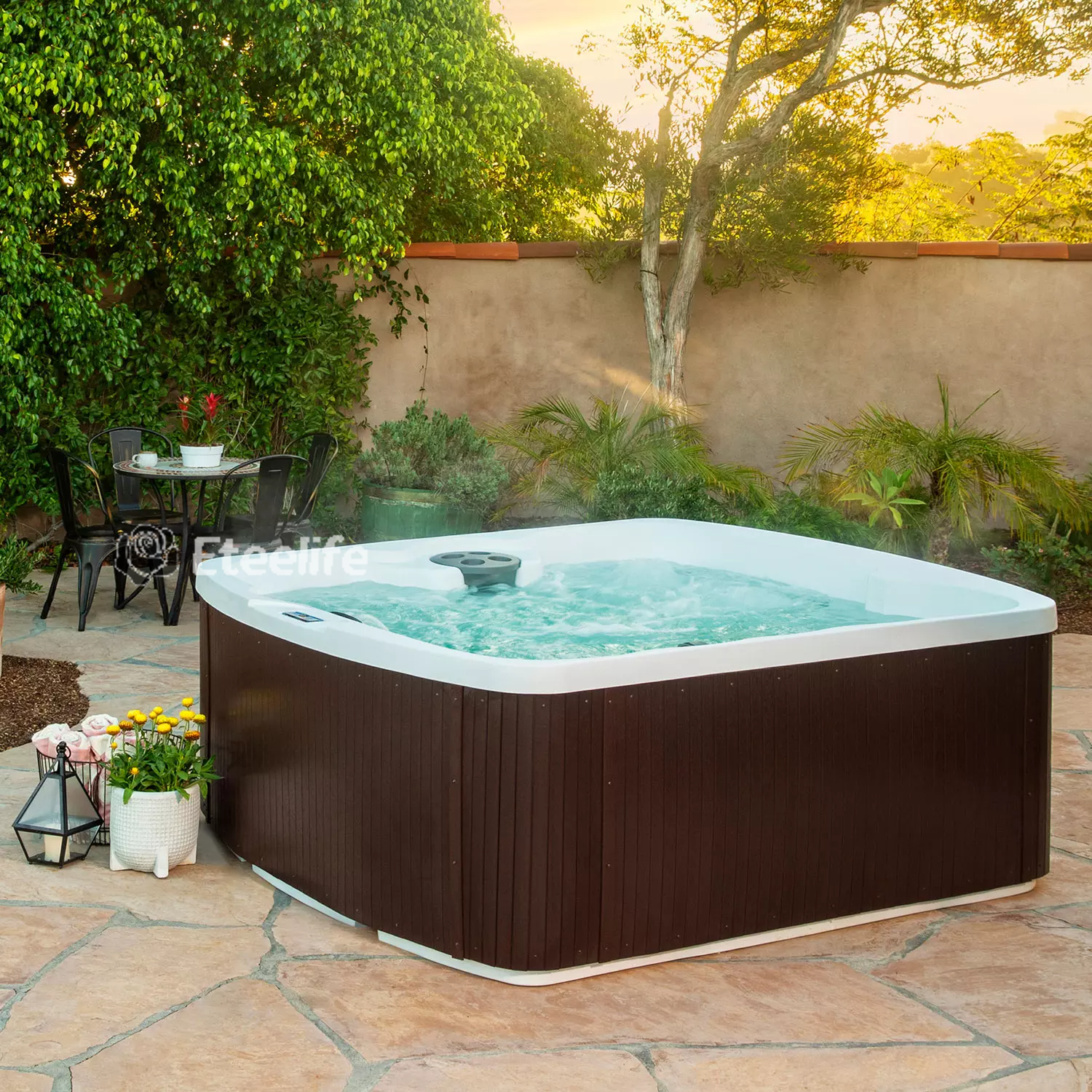 Enjoy the soothing hot water as you are surrounded by bubble jets, with 5 of your closest friends. It has an easy-to-use control panel that activates the 170 high-powered bubble jets that surround the interior of the spa, giving you a beautiful and relaxing massage.