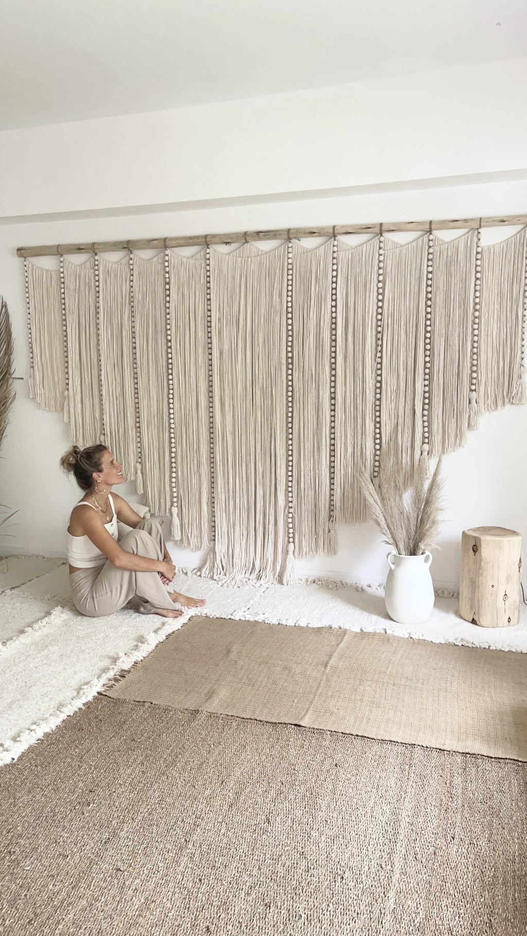Made with cotton thread, handmade ceramic balls and eucalyptus stick. It measures 3 meters wide x 2 meters long.