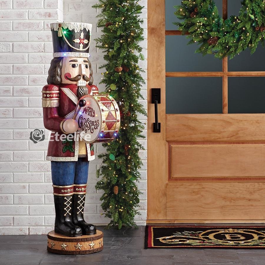 Standing nearly 5 feet tall, this stately nutcracker is dressed in his best uniform, complete with decorative hat and his drum at the ready. Crafted of polyresin with a handpainted finish, this nutcracker is adorned with multicolor LED lights that create a festive after-dark display.