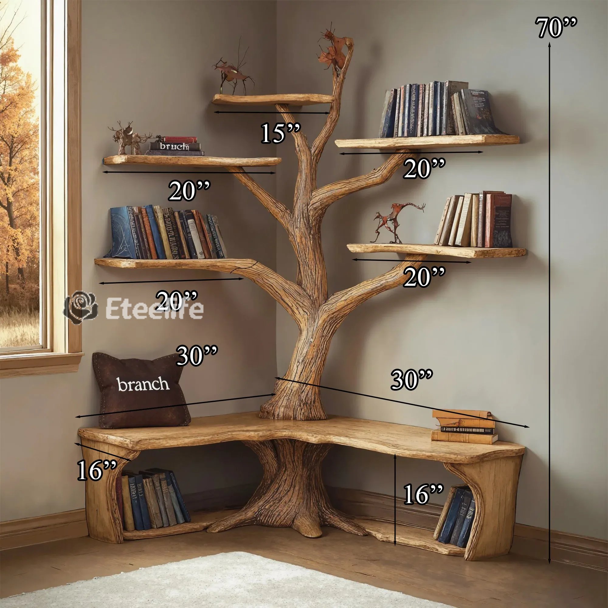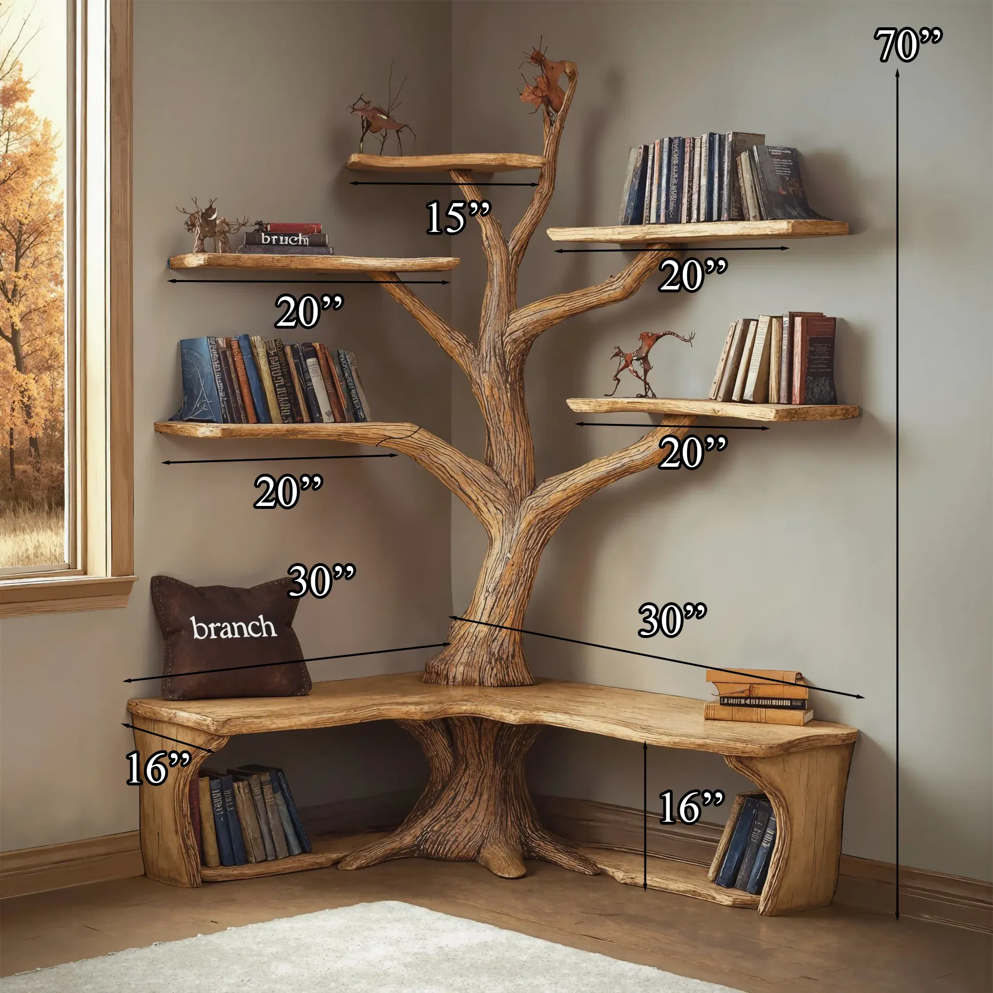 The Tree Branch Bookshelf with L-Shaped Bench offers a stylish, functional solution for book storage and seating, adding nature-inspired charm to any space.