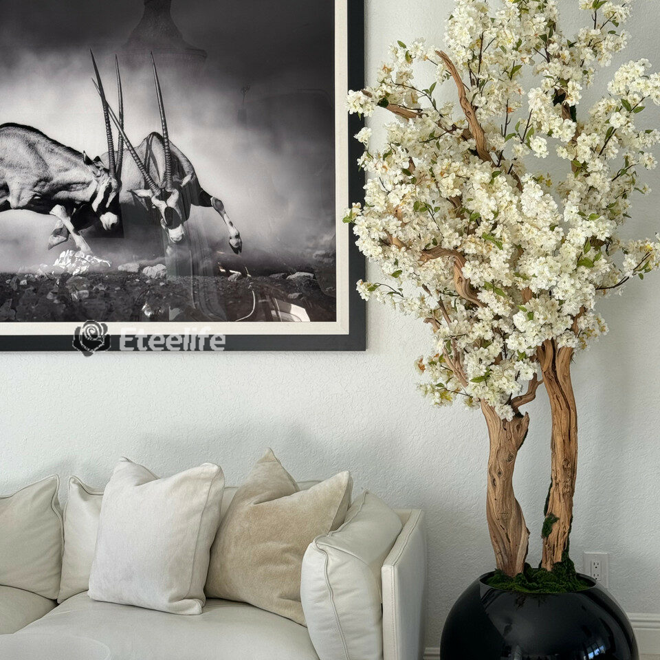 Cherry blossoms are a symbolic flower of the spring, a time of renewal, and the fleeting nature of life. Anchored in our glossy black 24″ globe vase which showcases a basic spherical shape, only with a modern twist. The full globe shape is the quintessential mix of traditional and contemporary styles as the round planters easily compliment any space around the home, garden or office. Its size and shape provide a perfect canvas for a our large white cherry blossom tree. Each tree is a one of a kind, flowers are placed by hand by our skilled artisans onto large wood trunks of California mountain wood. This bouquet of elegant white cherry adds a fresh and stylish touch to any room.
