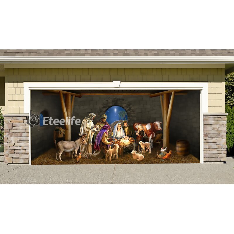 Nativity O Holy Night - Christmas Garage Door Decor - O Holy Night. The stars are brightly shining. It is the night of the dear Saviour's birth. Fits Standard 7 ft. x 16 ft. Garage Door. Flat or Paneled Garage Doors. Garage Door Decor is a Holiday Decoration that you hang on your garage door in a matter of just a few minutes. The Garage Door Decor makes it appear to people passing by that the garage door is open and you have a fun Holiday scene in your garage. My Door Decor created and manufactures the Garage Door Decor and there is nothing else that compares to the Garage Door Decor in Quality, Designs and Pricing. Garage Door Decor is designed to work on standard roll up doors and flat doors. All Garage Door Decors are made of the highest quality materials and construction for many, many years of enjoyment. The Garage Door Decor comes to you fully assembled in a reusable storage box and ready to hang on your door. The hardware we have developed allows you to hang the Garage Door Decor in a matter of just a few minutes and you are able to use your garage door as you normally would. There is nothing attached directly to the door (tapes, screws, etc.).
