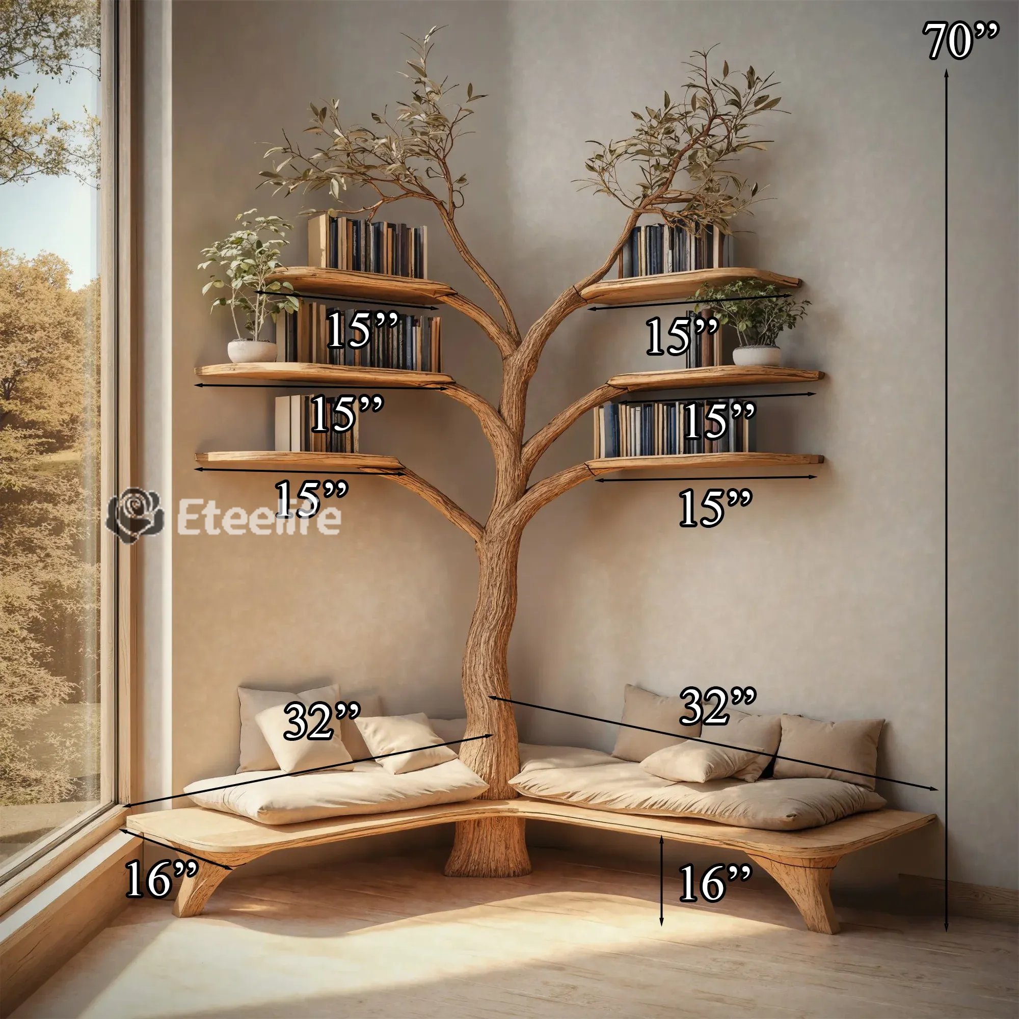 The Tree Branch Bookshelf with L-Shaped Bench offers a stylish, functional solution for book storage and seating, adding nature-inspired charm to any space.