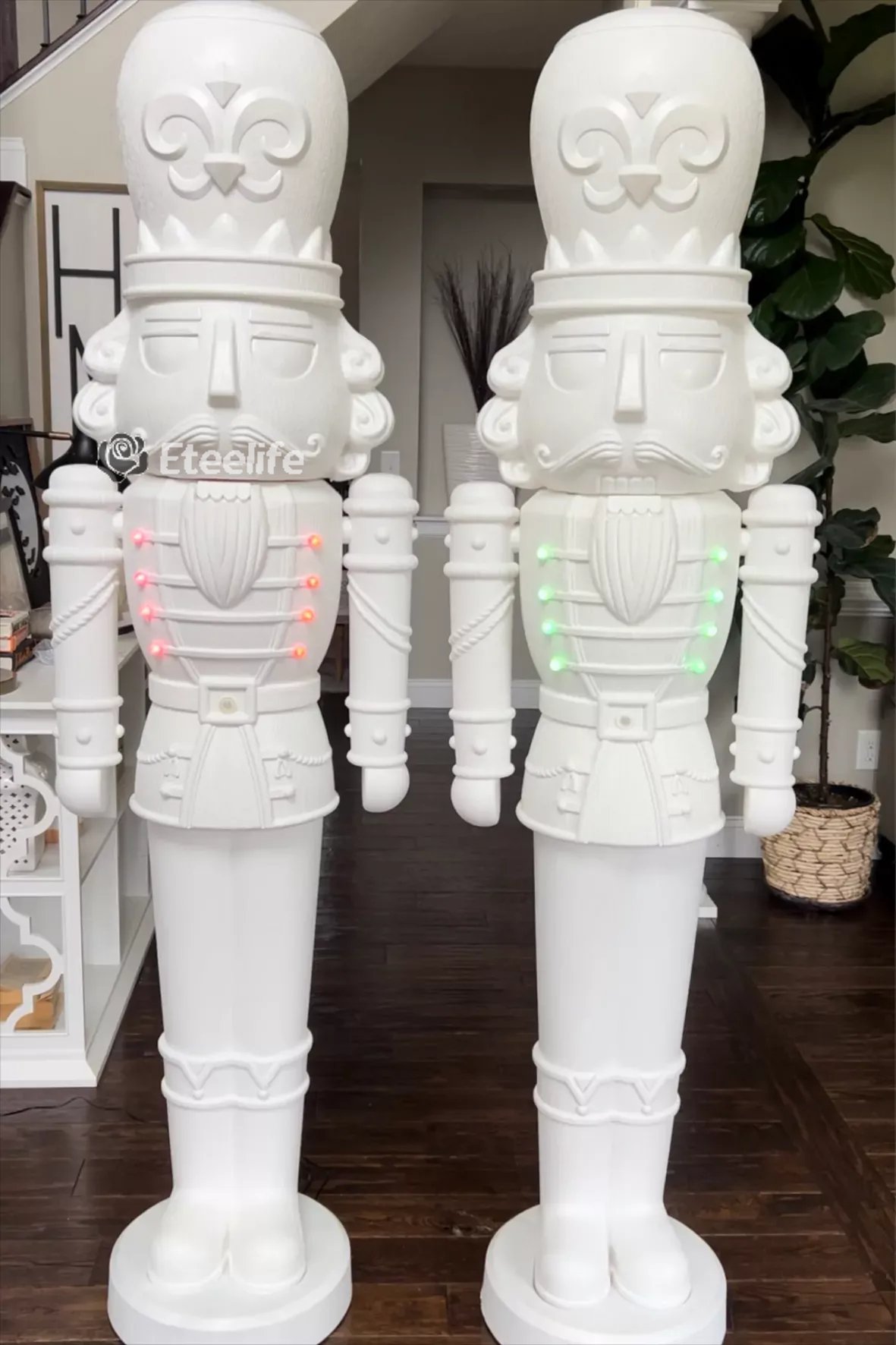 The festive nutcracker is a monochromatic white and includes beautiful details and textures. The buttons on the nutcrackers coat light up with bright LEDs and it plays music for a total holiday experience. The nutcracker is produced with a blow mold process that provides a stunning yet durable and lightweight product.